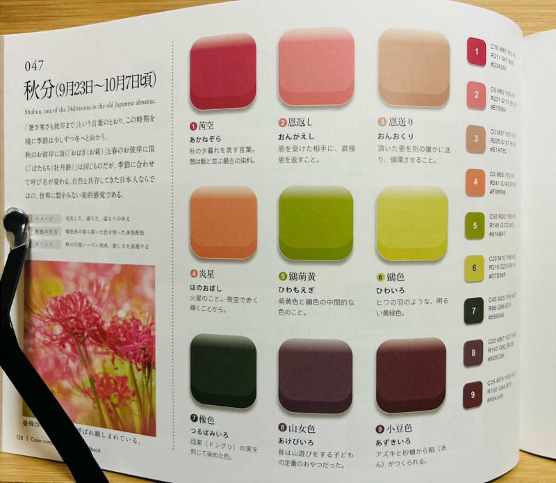 はい。配色本掲載の色は左上の赤色のみで、それ以外はガン無視してしまいました。じゃあ何の要素を拾ったんだよ?というと、この配色ページに掲載されていたヒガンバナの写真ですね。色はほぼ無視してヒガンバナモチーフ一点張りでデザインしちゃいました。ヘヘ…