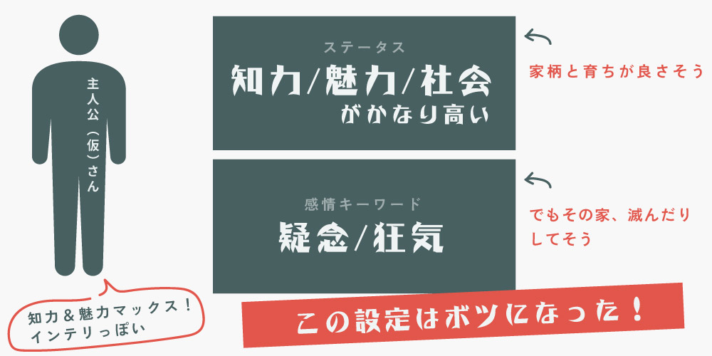 『疑念』でインテリステータスの主人公(仮)、『好奇心』でかなり肉体派のヒロイン(仮)……もうね、もうね、これでしょ……としか言いようがないくらい正反対そうでブチアガっちゃいましたよね。もう最初にこれを引けたから当創作企画が本格始動するに至ったと言っても過言ではないです。