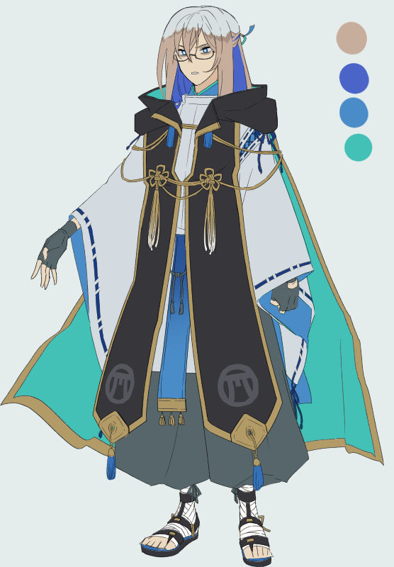 こういうデザインになりました。全体的に青いけど髪色は砂浜の色です。白と砂色のツートンがちょっと波打ち際っぽくて良いんじゃないだろうか。インナーカラーの青色も含めて髪の毛で海を表現出来てる気がします。彼が長髪キャラなのは多分この辺の兼ね合いですね。長い方が映えるから!…だったと思います。