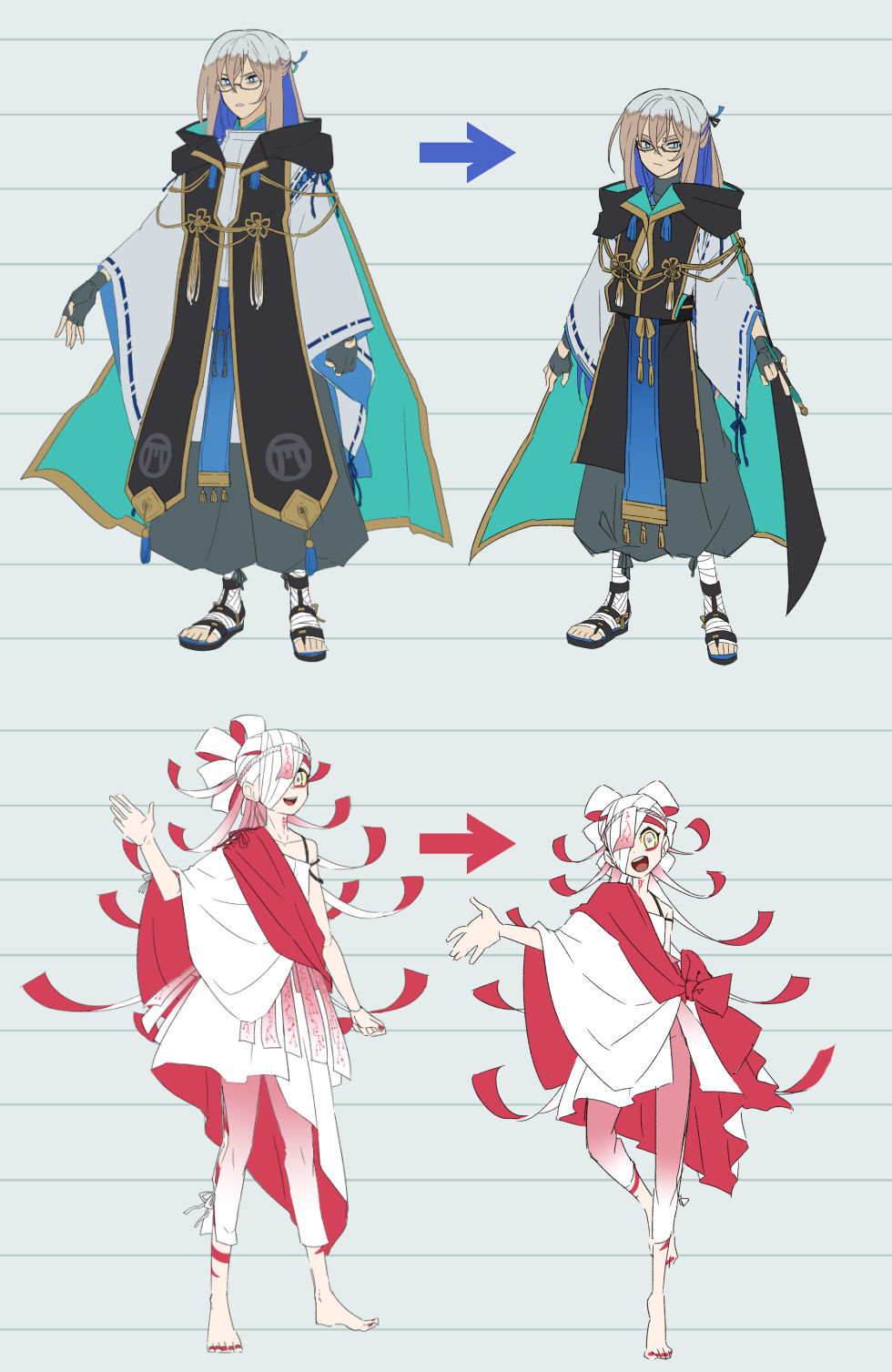 これはマンガにした時の作画コストや描きやすさ重視ですね。装飾は当然少ない方が描きやすいですし(それでも相当ヒラジャラしてるけどこれは私の趣味なのでOK)、基本等身はある程度下げておいた方が作画崩れを予防できると思ったので。致命的に下手なんですよ私 面長美男子描くのが